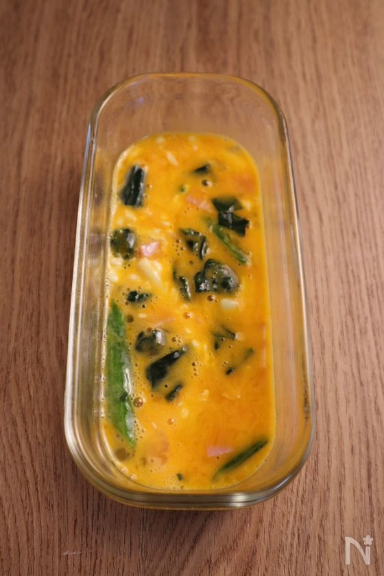 (2) 耐熱容器にサラダ油(分量外)を塗り、①を流し込む。ふんわりラップをかけ電子レンジ(600W)で3分加熱する。