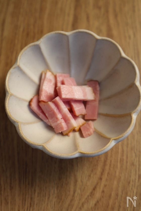 (4) 業務スーパーの吊るしベーコン切り落としを使用しました。切り落としなので形はさまざまですが、その分使い勝手がよく、朝食のベーコンエッグ、パスタ、スープ、チャーハンなど日常のあらゆる料理に活用できます。大容量なので、使いやすい大きさにカットして冷凍しておくと、必要な分だけ取り出せてとても便利です。