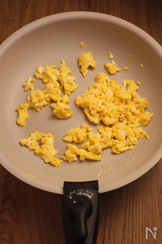 (2) 中火で熱したフライパンにバターをひき、混ぜ合わせた【A】を入れ、炒り卵を作る。