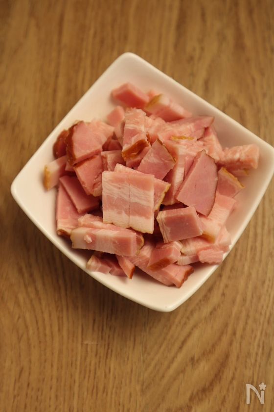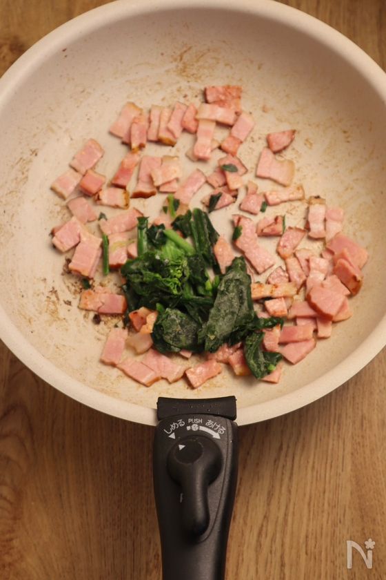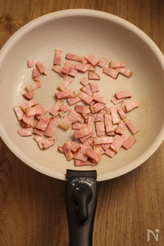 (3) サラダ油を入れ、ベーコンを入れたら焼き色がつくまで炒める。
