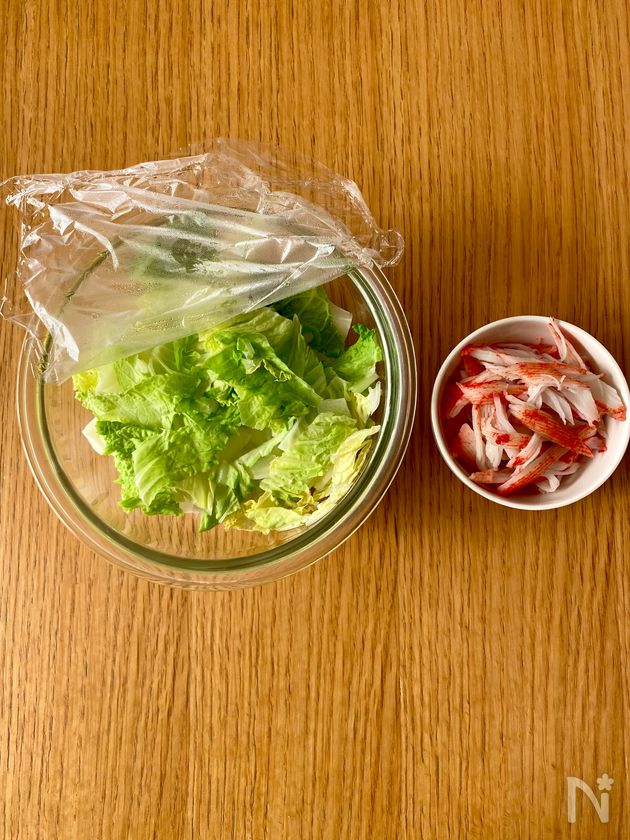 (下準備) 白菜は芯の部分を1㎝幅、葉の部分を2㎝幅に切り、耐熱ボウルに芯が下にくるように入れ、ふんわりとラップして600Wのレンジで4分加熱する。加熱後水気をきる。