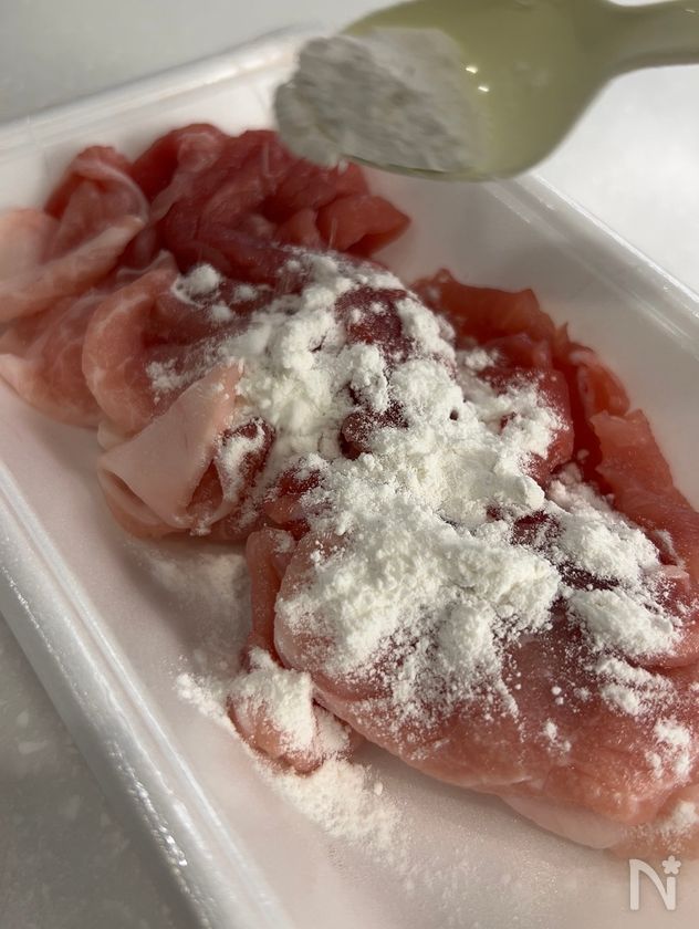 (下準備) 豚こま切れ肉に米粉をまぶす。