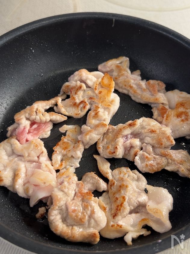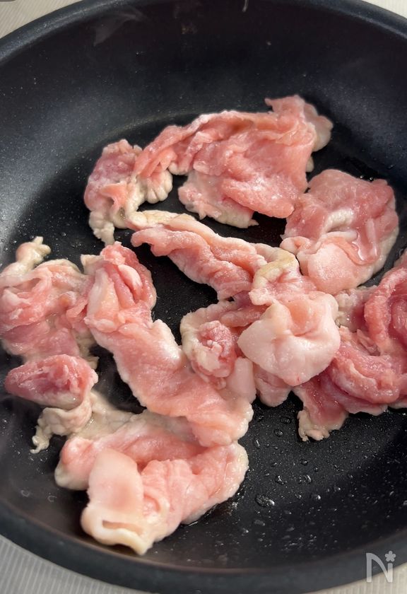(1) フライパンにごま油をひき、中火にかけ、豚肉を入れる。