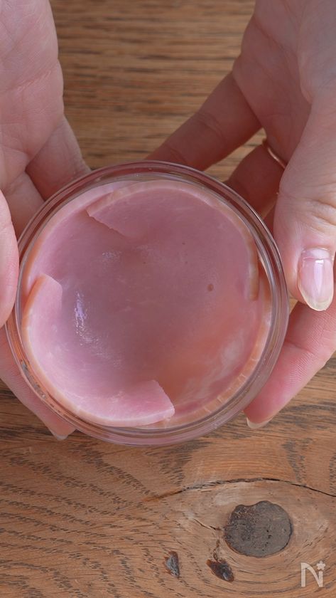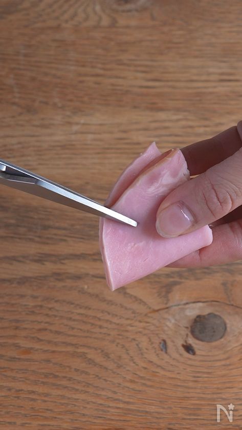 (1) ロースハムを二つ折りにして1カ所切り込みを入れ、耐熱用のカップに入れる。