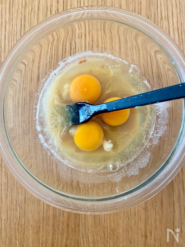 (1) 豆乳もボウルに入れて混ぜ、卵も加えて更に混ぜる。