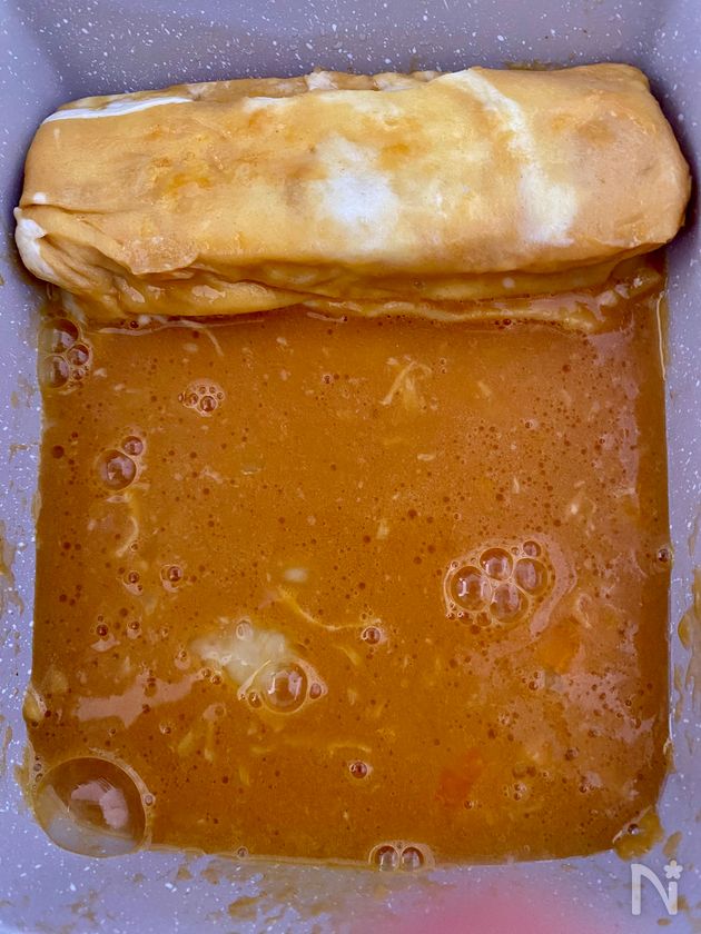 (2) こめ油をひいたフライパンを熱し、厚焼玉子を焼く要領で、3回に分けて卵液を流し入れ、巻く。
