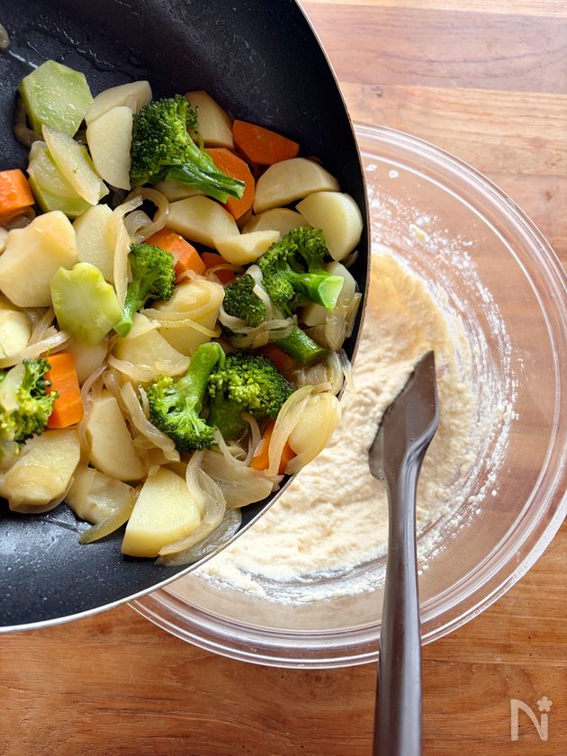 (3) フライパンにサラダ油をひいて中火にかけ、玉ねぎをしんなりするまで炒める。ブロッコリーの茎、にんじんを入れて1分ほど炒め、じゃがいもを加えてじゃがいものフチが透き通ってくるまで炒める。