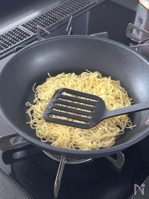 (2) 焼きそばは袋ごと600wの電子レンジで30秒加熱し、フライパンで多めの油でほぐしながら炒める。