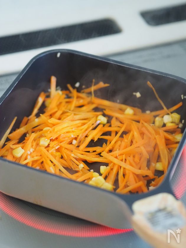 (2) フライパンにオリーブ油をひいて中火で熱し、にんじんとにんにく、コーンを炒める。