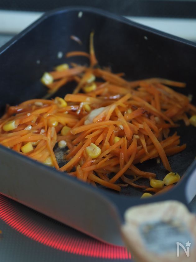 (3) にんじんがしんなりしたら【A】を加えてさっと炒める。