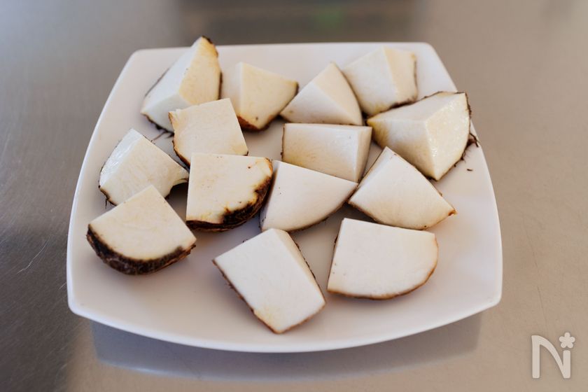 (3) 里芋の粗熱が取れたら皮をむき、食べやすい大きさに切りボウルに入れ、塩(里芋の下味用)で薄く下味をつける。