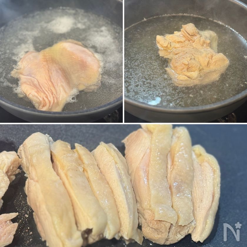 白だしを加えてさっと混ぜ、火を止める。鶏肉を取り出し、食べやすい大きさに切る。