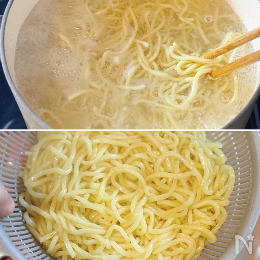 (2) その間に、別の鍋でたっぷりの湯を沸かし、中華麺を表記時間より30秒〜1分ほど早めに茹でる。茹で上がったらしっかり湯を切り、器に盛る。