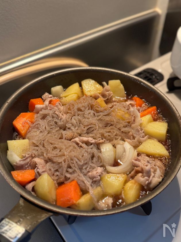 (3) 2の全体に油が回ったら、食べやすい長さに切った白滝と【A】を加えて蓋をし、弱めの中火で12分程度煮る。