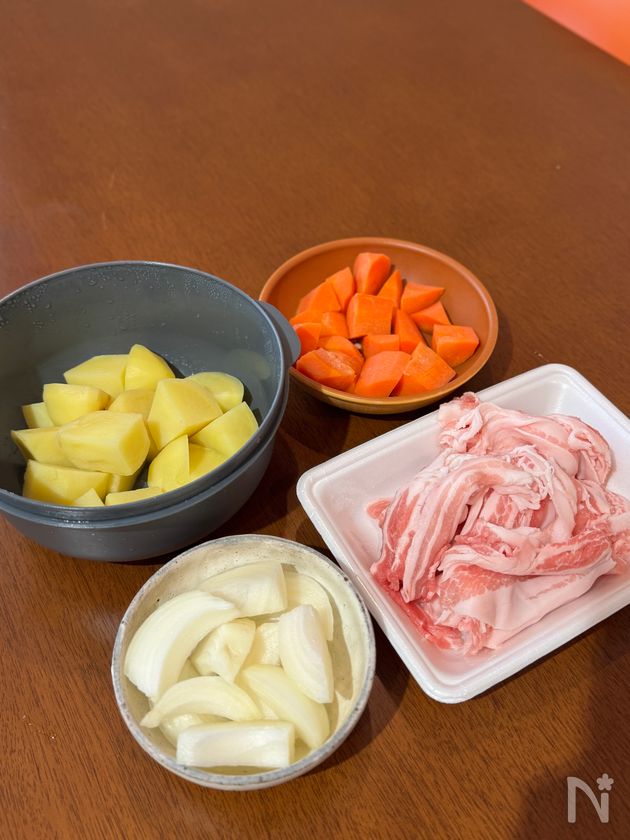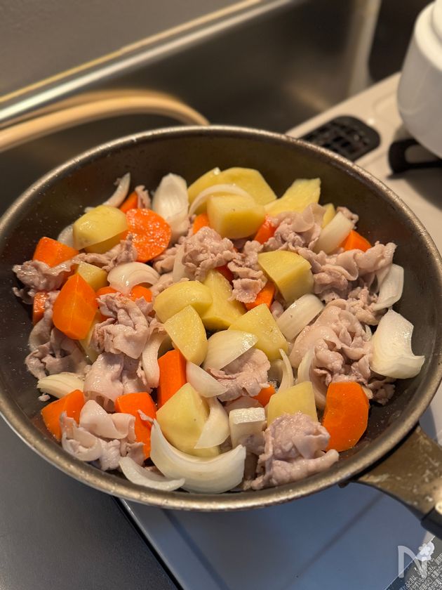 ・火の通りにくいじゃがいもと人参はレンジ加熱をして時短に。フライパンでサラダ油が回るまで炒めることで、油でコーティングされて煮崩れを防止しています。