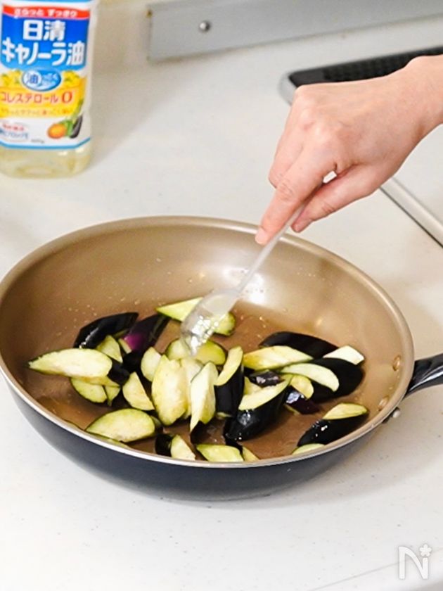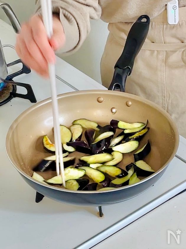 (2) ナスをフライパンに1〜2cm太さの細切りにして入れ、塩、サラダ油を絡めて広げる。