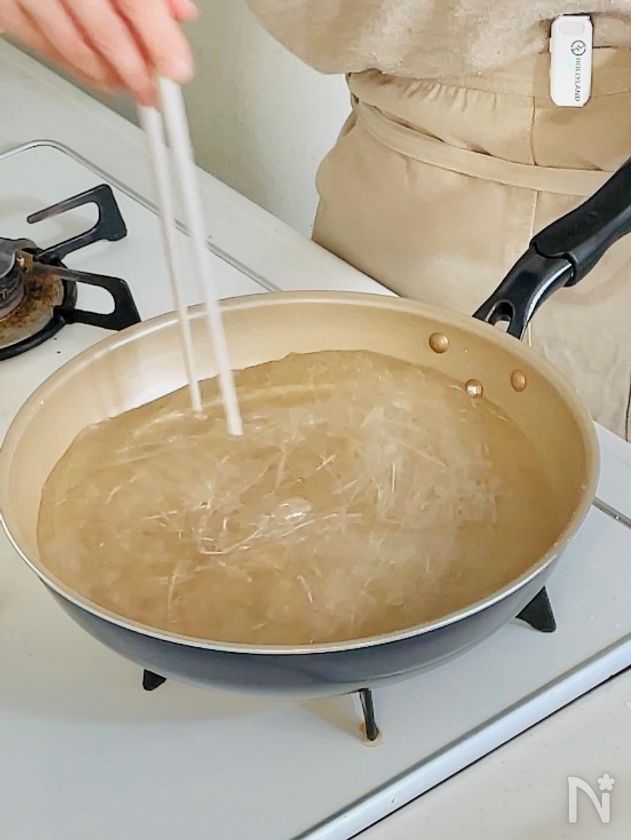 (5) フライパンにお湯を沸かし、春雨を加えて煮る。