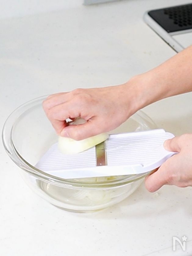 (1) 玉ねぎはスライサーで薄切りにして、ボウルにいれ、