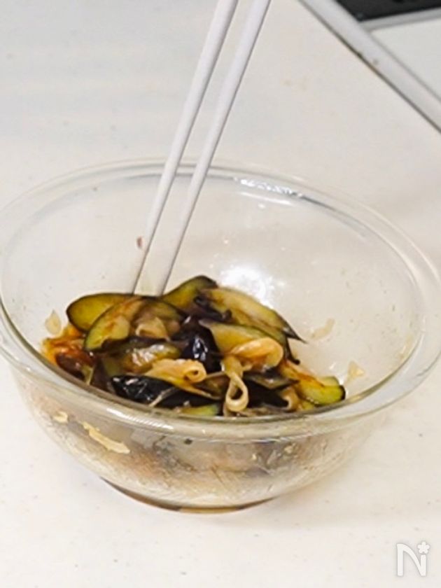 (4) ナスをボウルにうつし、混ぜ合わせる。