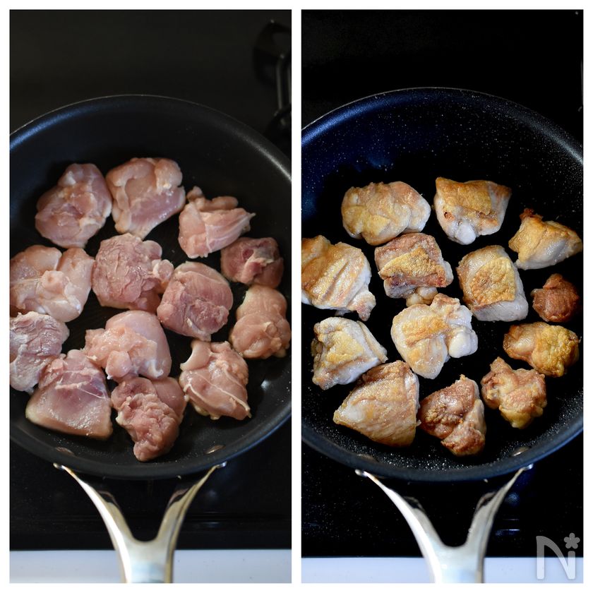 (3) フライパンにごま油小さじ2 (分量外)を中火で熱し、鶏肉の皮目を下にして並べる。3分ほど焼いたら裏返し1分ほど軽く焼く。