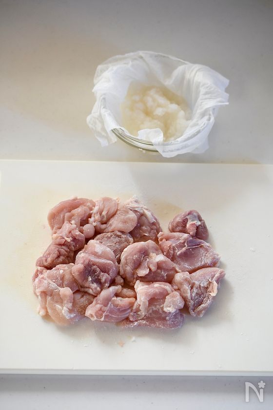 (2) 鶏もも肉はひと口大に切って塩をふり、片栗粉をまぶす。【A】は合わせておく。