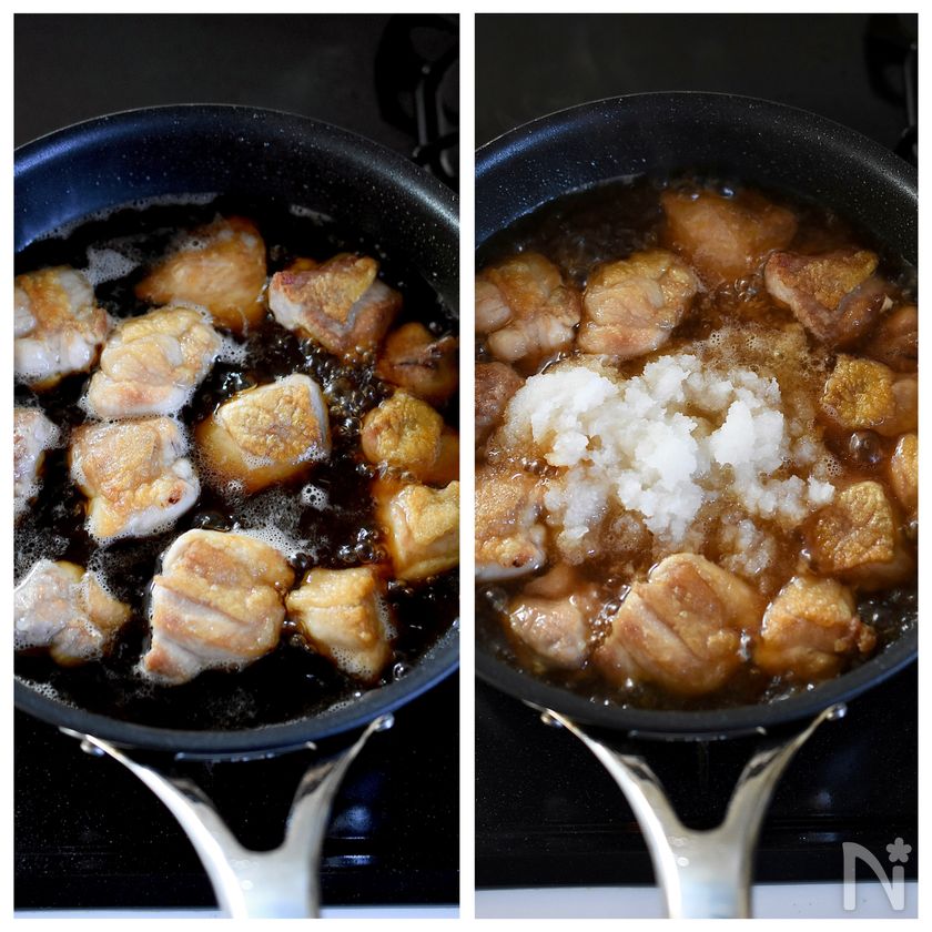 (4) 余分な脂を拭き取り、2で合わせた【A】を加えて煮立たせる。大根おろしを加え、さらに3分煮込む。