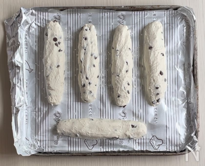 (3) 5〜6等分にし、くっつかないホイルシートの上に生地を乗せる。水で濡らした手で棒状に形を整える。
