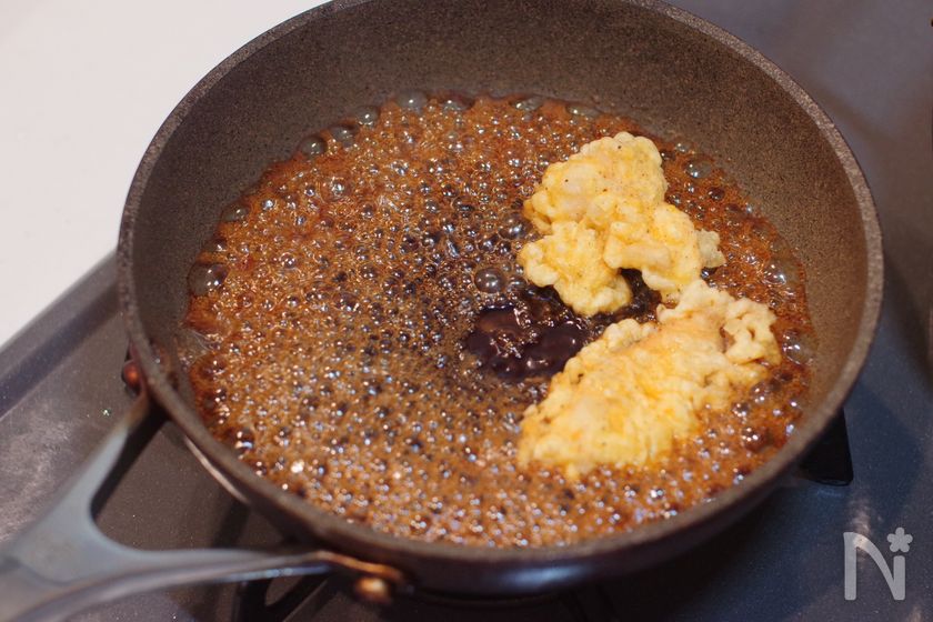 (5) フライパンに【A】を入れてフツフツしてきたら揚げた鶏肉に絡める。