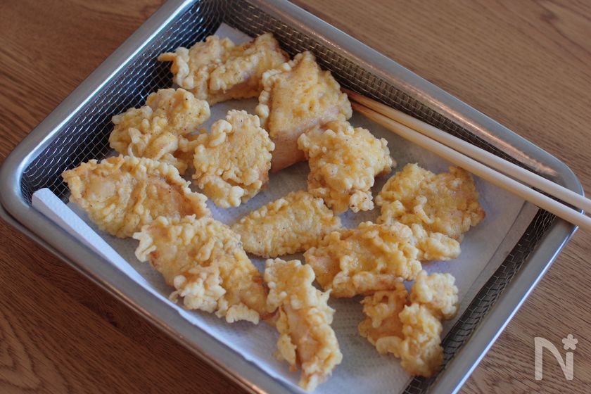 (3) 合わせた【B】の衣に鶏むね肉を入れて160℃の揚げ油でじっくり火が通るまで揚げる。