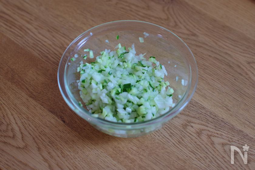 (1) タルタルソースを作る。きゅうりと玉ねぎはみじん切りにする。ボウルにきゅうりと玉ねぎを入れて塩小さじ1(分量外)を入れて塩もみをして3分置いたら水にさらして水気を絞る。卵を沸騰したお湯で9分茹でて氷水で冷ましてゆで卵を作る。ボウルにゆで卵を入れて潰す。きゅうり、玉ねぎ、【C】を合わせる。