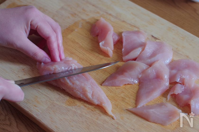 (2) 鶏むね肉は一口サイズのそぎ切りにして両面に塩・胡椒をする。