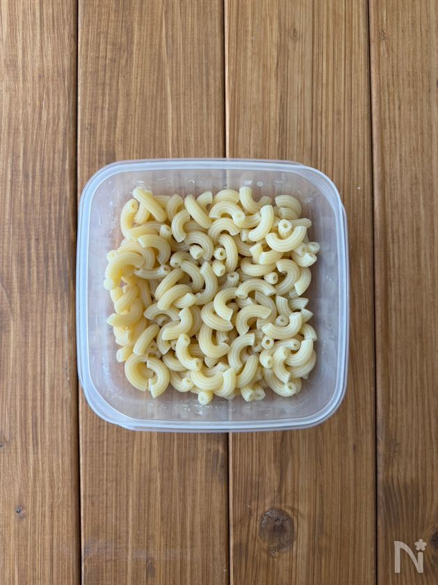 (1) 深めの耐熱容器にマカロニと【A】を入れ、ふんわりとラップをかける。