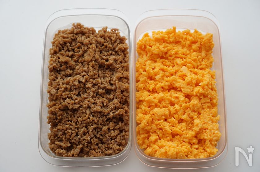 (8) 器にご飯、その上にそぼろを半々ずつ盛る。
