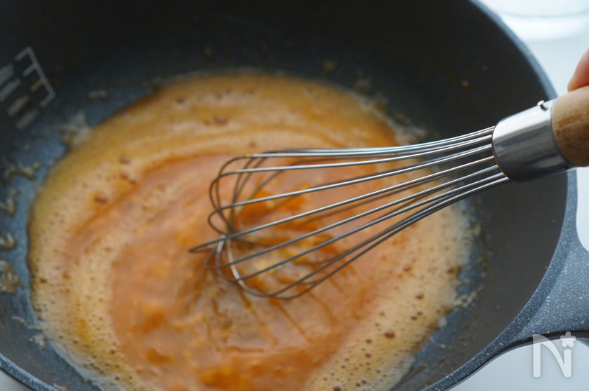 (5) 泡立て器、もしく菜箸数本で素早く混ぜる。
