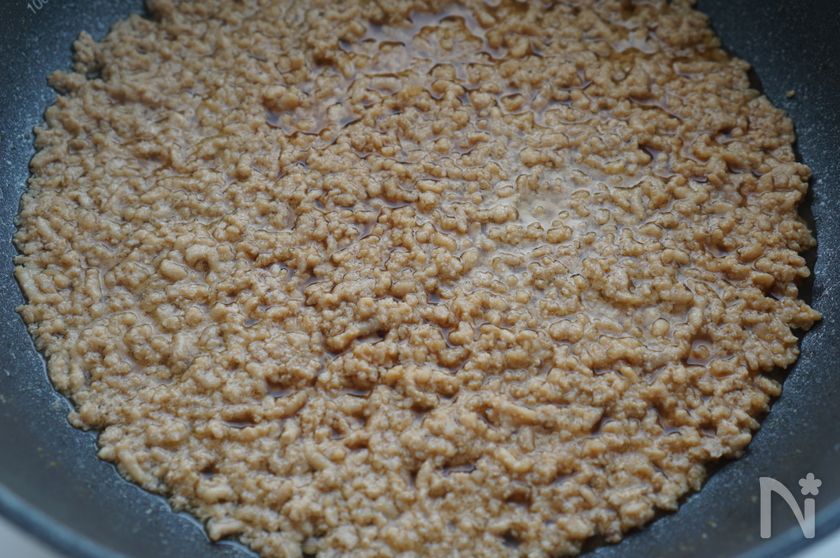 弱中火でゆっくり火を通していきながら、ひき肉を木べらでほぐしながら混ぜる。