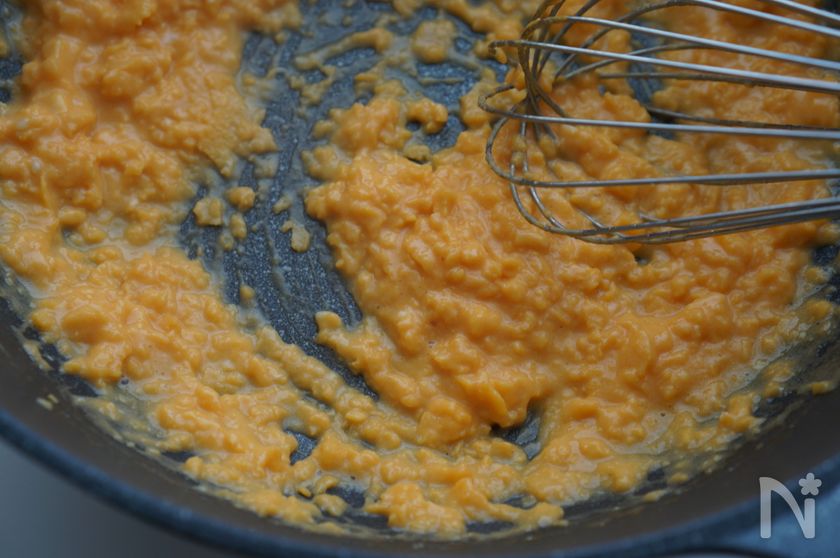 (6) 半熟より少し固まったかなくらいのところで(写真参照)、今度は木ベラに持ち替えてかき混ぜる。