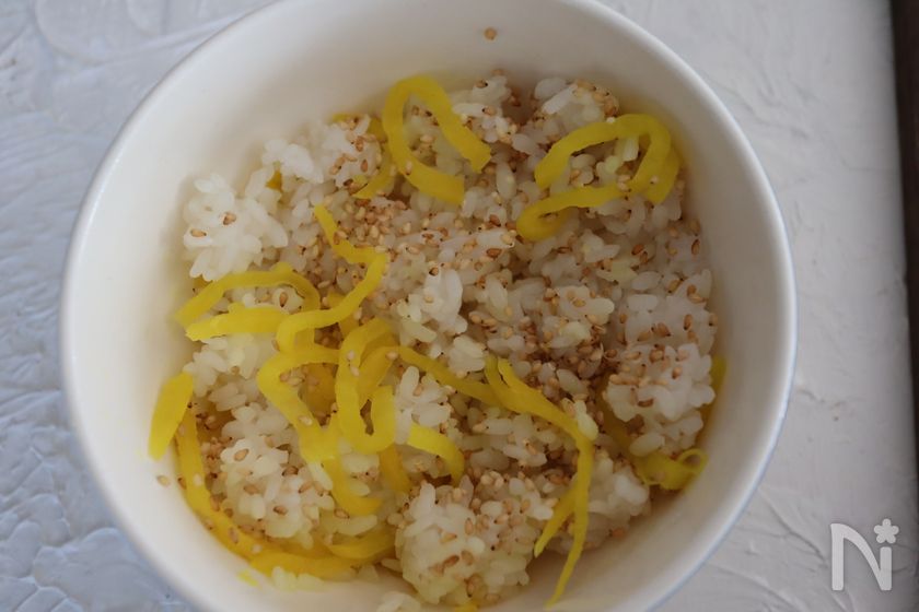 (1) ごはんに刻みたくあん、白いりごまを混ぜてどんぶりによそう。