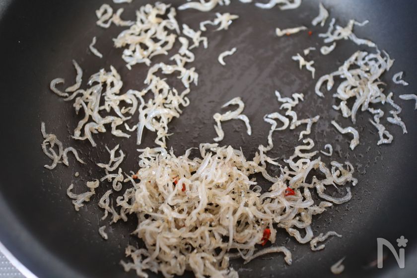 (3) 熱したフライパンごま油を入れて鷹の爪、じゃこを入れてカリカリになるまで炒め、火を止め麺つゆ(2倍濃縮)を入れて混ぜる。