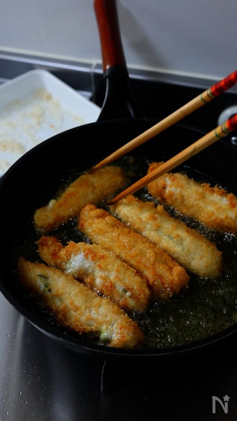 (2) フライパンにサラダ油を深さ1cm程入れ180℃に熱する。