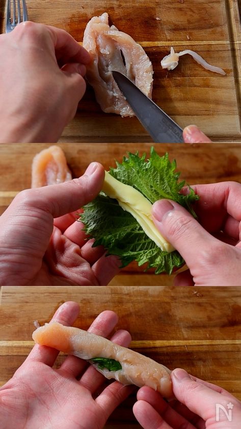 (下準備) ささみは好みで筋をとり、真ん中から左右に開く。