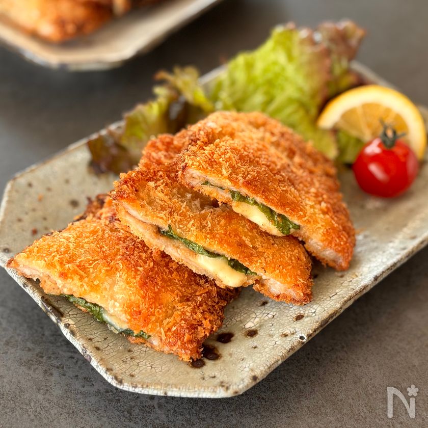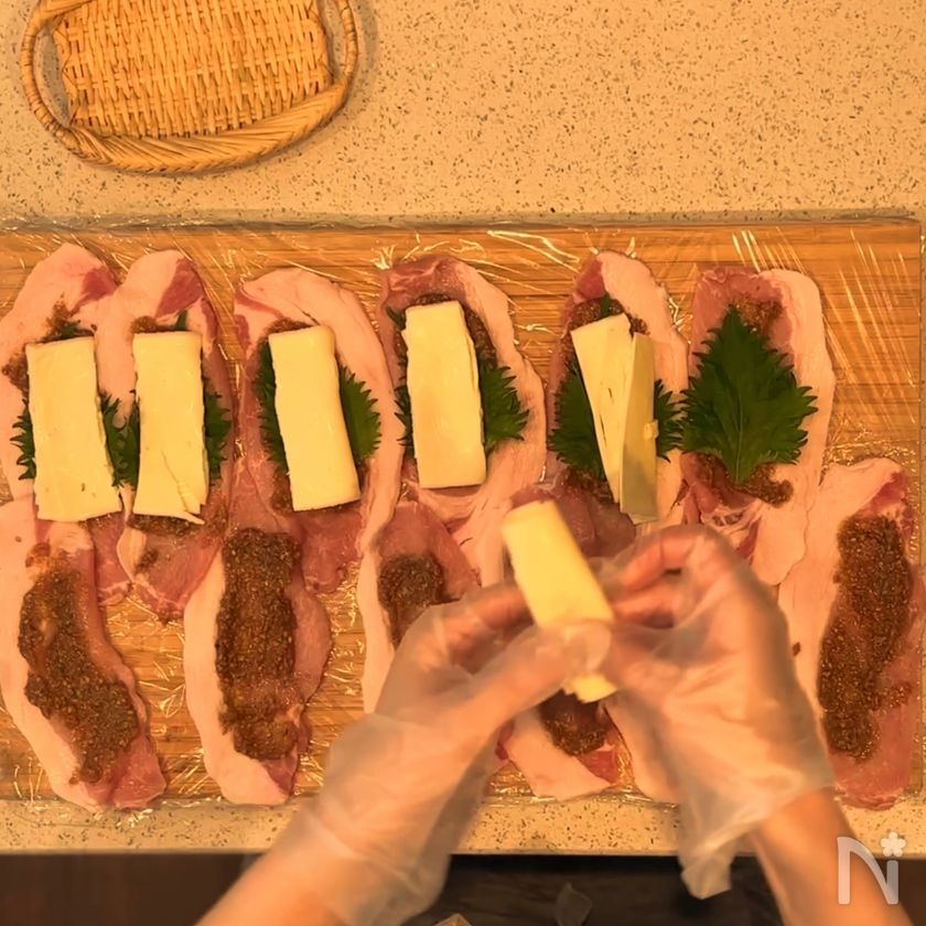 (2) 大葉を乗せ、スライスチーズを三つ折りにして乗せる。