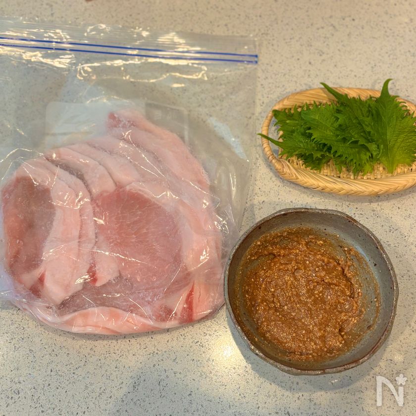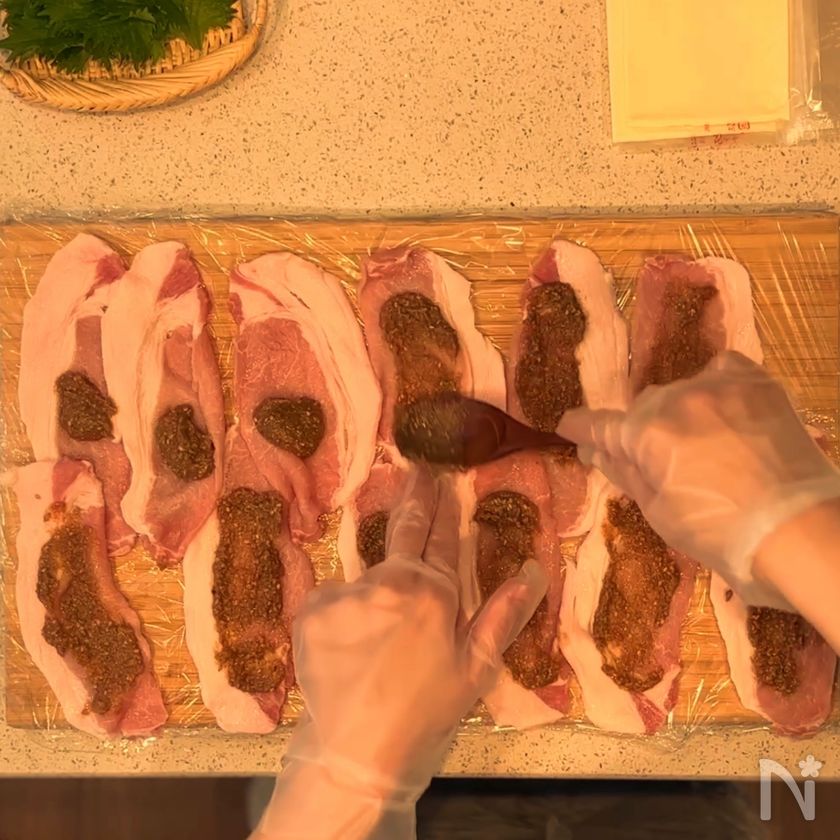 (1) 豚ロースを並べて【A】を混ぜ合わせたものを片面に塗る。