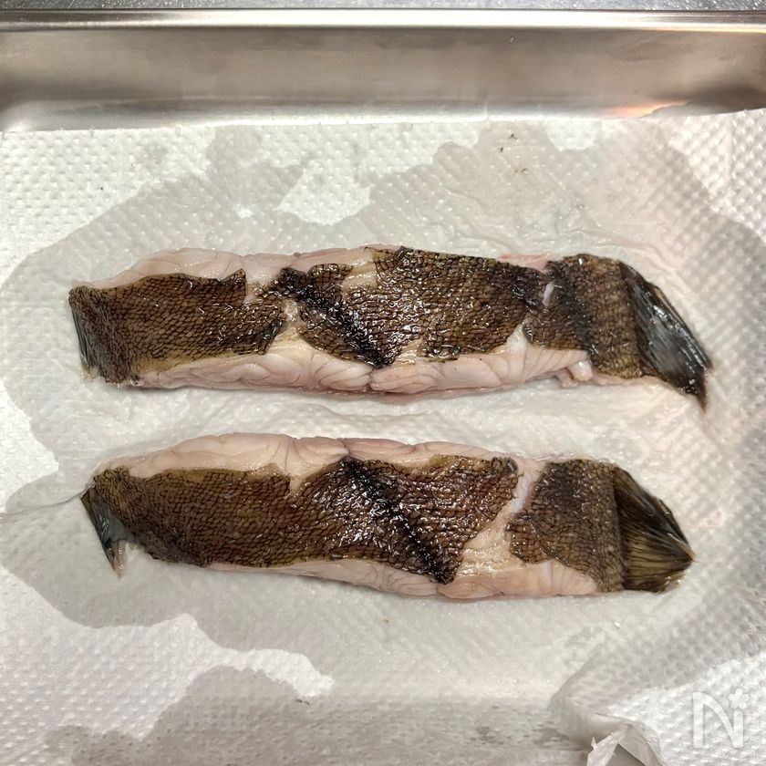 霜降りをするのが億劫に感じる場合は、代わりにかれいの両面の皮を包丁でこそげてぬめりを除き、水で洗ってペーパータオルで水気を拭く。
