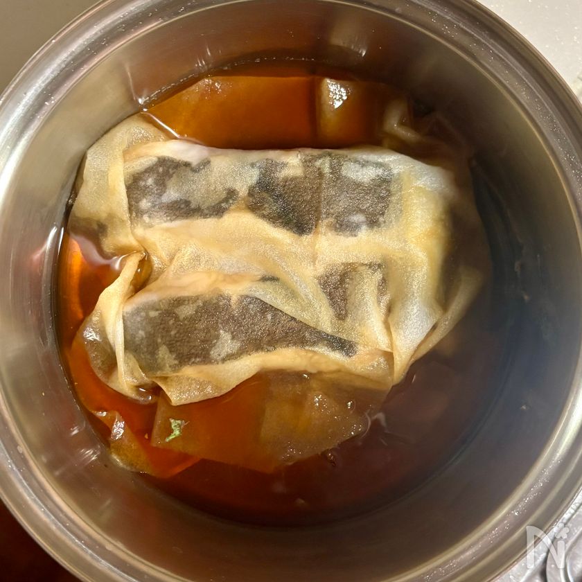 (5) クッキングペーパーを煮汁を絞って取り、すき間に長ねぎを加える。