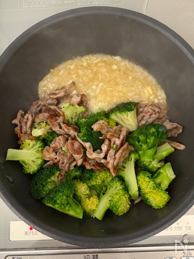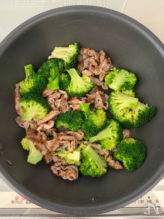 (3) 肉に火が通ったら、強めの中火にし、ブロッコリーをいれ、油が回る程度炒める。