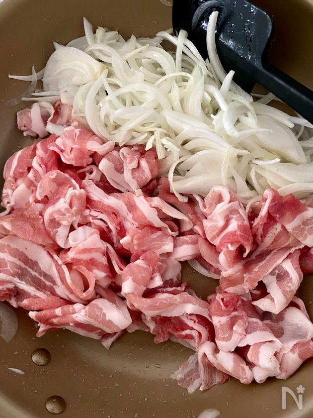 (1) こめ油をひいたフライパンを熱し、新玉ねぎを中火で1分ほど炒めたら、豚肉を加え、中火で5分ほど混ぜ炒める。