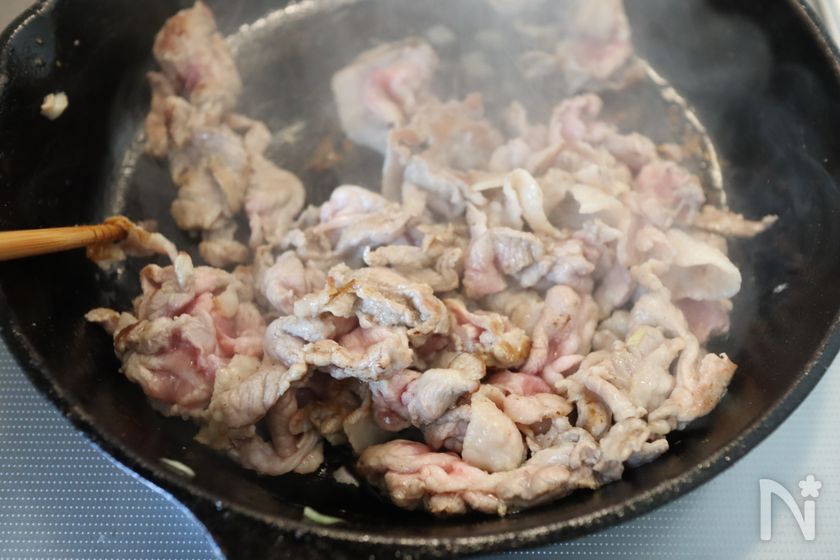 (1) フライパンを熱し、油(分量外)少量挽いて豚こま肉を中火で炒める。