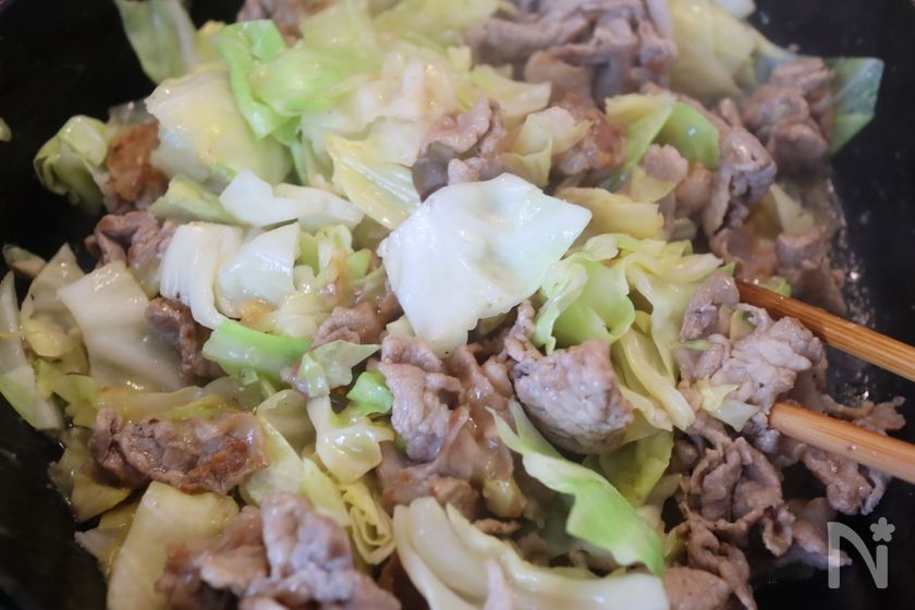 (3) 豚こま肉がほぼ焼けたら、キャベツを加え【A】を加えて煮詰める。
