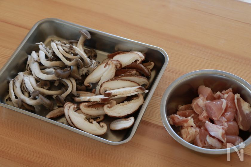 ・しいたけは石づきを落として、笠は5mm厚、軸は薄切りにする。