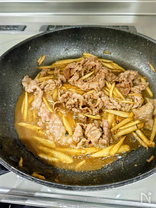 ごぼうはじっくりやわらかくなるまで焼き炒めします。